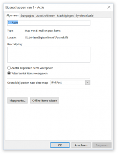 Om snel te kunnen zien hoeveel items er in iedere map staan heb ik de mappen “Actie”, “Wachten op” en “Ooit” aangepast. Hier heb ik de radio button gezet bij “Totaal aantal items weergeven” i.p.v. bij de standaard optie “Aantal ongelezen items weergeven”.