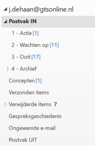 Ik heb deze in mijn eigen mailbox genummerd zodat de volgorde vaststaat. Ook heb ik alle mappen die ik al had onder de map Archief gezet. Zoals je ziet geeft de naam van de map al aan wat de bedoeling is van de e-mail die er in staat. In de map “Actie” staat alle e-mail waar iets mee gedaan moet worden. In de map “Wachten op” staat alle (in mijn geval vooral zelf verzonden) e-mail waar ik een (re)actie op verwacht van een ander. In de map “Ooit” alle e-mail die nu niet relevant zijn, maar waar ik later wellicht nog wat mee wil. En alle e-mail die verwerkt is in de map “Archief”.