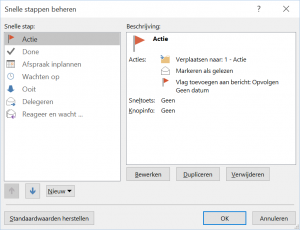 Zo heb ik de knop “Actie”, waarmee de geselecteerde e-mail verplaatst wordt naar de bijbehorende map “Actie”, wordt de e-mail gemarkeerd als gelezen en wordt deze gemarkeerd met een vlag zonder einddatum. En een knop “Done” die de e-mail archiveert. Enzovoorts.