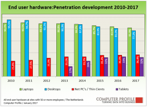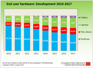 De toename aan mobiele devices binnen de verschillende sectoren zal de komende jaren verder gaan toenemen. De voornaamste oorzaak voor het dalen van het aantal desktop- en laptops komt door het introduceren van Cloud oplossingen. Microsoft, Amazon en Google, maar ook kleinere leveranciers van specifieke bedrijfssoftware, zorgen ervoor dat interne processen (bedrijfsactiviteiten) uitgevoerd kunnen worden op mobiele devices. Naast Cloud toepassingen heeft applicatie-virtualisatie met bijvoorbeeld Citrix Xenapp, Microsoft Remote Desktop Services of VMware Horizon ervoor gezorgd dat medewerkers steeds vaker een flexibele werkplek zoals thin client of tablet kunnen gebruiken.