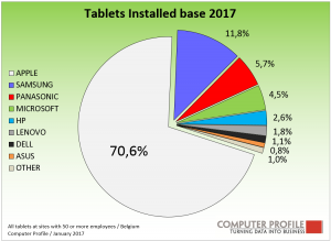 In 2010 heeft Apple de eerste IPad geïntroduceerd, sindsdien is het gebruik van tablets in de zakelijke markt vrij snel toe genomen. Inmiddels lijkt de toename en in gebruik name van tablets over zijn hoogste punt heen. De eerdergenoemde publieke sector maakt het meest gebruik van tablets (40%) daarentegen wordt in de transportsector het minst gebruik gemaakt van tablets.
