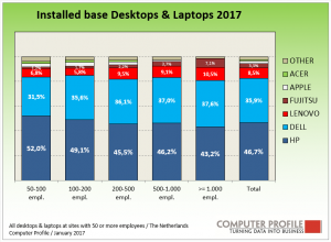 Van het totale aantal desktops en laptops dat Computer Profile aantreft wordt het grootste deel gevormd door de systemen van HP. Circa 47 procent van het totaal betreft een HP Inc. systeem. Na HP vormen de desktops en laptops van Dell, met een aandeel van 36 procent, de tweede grootste groep. Lenovo heeft vanaf 2010 terrein gewonnen op de Nederlandse Markt terwijl Fujitsu terrein heeft verloren.