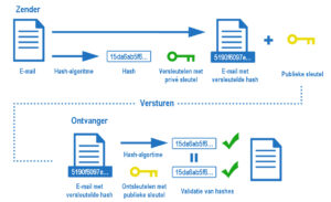 Allereerst moeten zender en ontvanger een Digitaal ID in de vorm van een certificaat hebben. Deze worden uitgegeven door een Certificaat Autoriteit (CA), zoals bijvoorbeeld Comodo, Symantec of GlobalSign. Zo’n certificaat bestaat uit twee delen, namelijk een privé deel en een publieke deel. Die delen worden ook wel sleutels genoemd. Met het publieke deel van een certificaat kan de data worden versleuteld. Deze versleutelde data kan vervolgens alleen worden geopend met het privé gedeelte van de certificaat. Andersom is ook mogelijk en wordt gebruikt voor het verifiëren van de integriteit van de inhoud van de data. Oftewel: is er tussen verzenden en ontvangen niets gewijzigd in de inhoud.